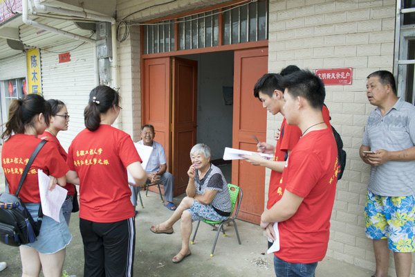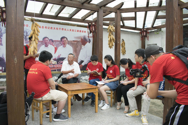 参观纪念馆,学习小岗精神。“沈浩同志对党忠诚、对人民热爱,任劳任怨为老百姓干好事、干实事。”这是习近平总书记对沈浩同志的评价。师生们首先参观了沈浩同志先进事迹陈列馆,从大量的图片、视频、实物、场景等,深刻学习感悟沈浩同志“扎根基层、无私奉献、艰苦奋斗、锐意改革”的先进事迹。 接着参观了大包干纪念馆。大包干纪念馆内分为主展厅《抉择》、《追梦》、《关爱》三个展区和大型群雕《十八颗红手印》等组成,通过丰富详实的史料,再现了当年大包干从酝酿到发生、发展的历史过程。通过参观,学习领会“敢为人先,实事求是,锐意进取,与时俱进”的大包干精神,探寻中国农村改革变迁的历史源起。随后,在霏霏细雨中,同学们怀着崇敬的心情来到沈浩同志墓前默哀致敬,敬献花篮,重温入团誓词。 走访调查,了解实情变化。团队成员深入小岗村、红心镇等地,走村入户,通过问卷调查、访谈当地居民,探寻改革开放以来的变化,了解当地民众对改革开放以来乡村巨变的感受,以及他们的新时代新期待。 期间,同学们集中访谈大包干十八位带头人之一关友江,听他讲述改革开放四十年小岗村的发展变化、沈浩同志6年的小岗工作细节。“从茅草屋到红瓦房,再到今天的二层小楼,这日子放在40年前想都不敢想。”、“沈浩关心老百姓的生活细节,能和老百姓打成一片,看不出他是一位省里选派干部。”在问及村民们现在最大的期待时,他笑道,“现在村民的腰包都鼓起来了,吃穿基本都不愁,想娃娃们的教育能抓得更紧些,教育制度可以更加完善。”