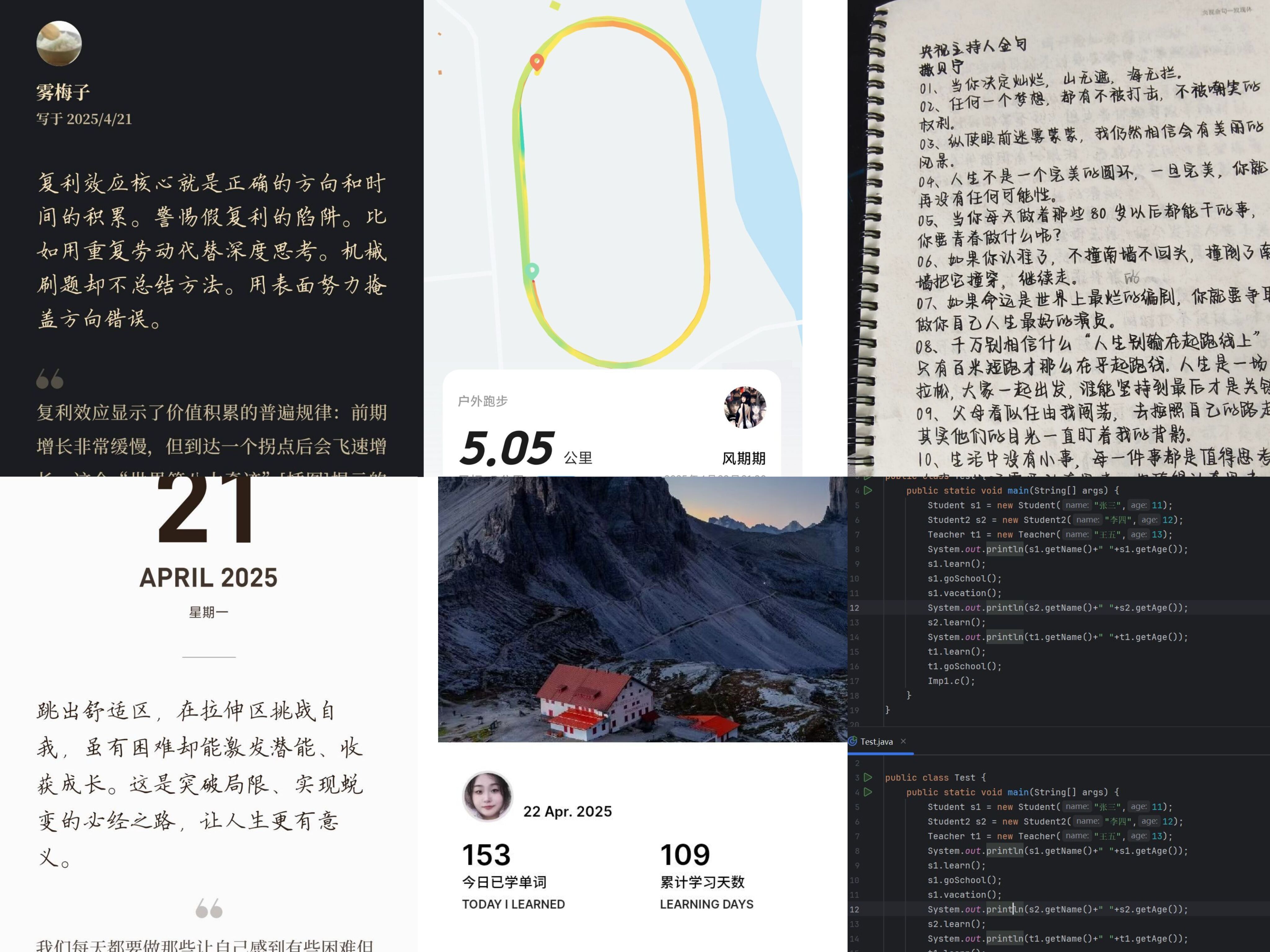 “21天效应”源于行为心理学理论,即21天的重复行为可初步形成习惯。学院自2021年起创新打造这一品牌活动,结合学生成长需求与专业特色,每年设定不同主题,通过科学设计、朋辈互助、正向激励等方式,帮助学生在坚持中收获成长。本次活动以“心向晨曦,习惯致远”为主题,设置五大打卡模块:“认知觉醒”共读计划:精选书籍《认知觉醒》,引导学生通过阅读与每日心得分享,提升自我认知与情绪管理能力;“笔墨润心”书法打卡:将美育与心理调适相结合,让学生在书写中静心凝神,陶冶情操;“代码筑梦”专业训练:结合计算机学科特色,鼓励学生每日完成编程任务,强化专业技能;“单词赋能”外语学习:通过英语打卡强化基础能力,助力学生四六级。活力跃动跑步计划:倡导运动健康生活方式,强化身体素质。