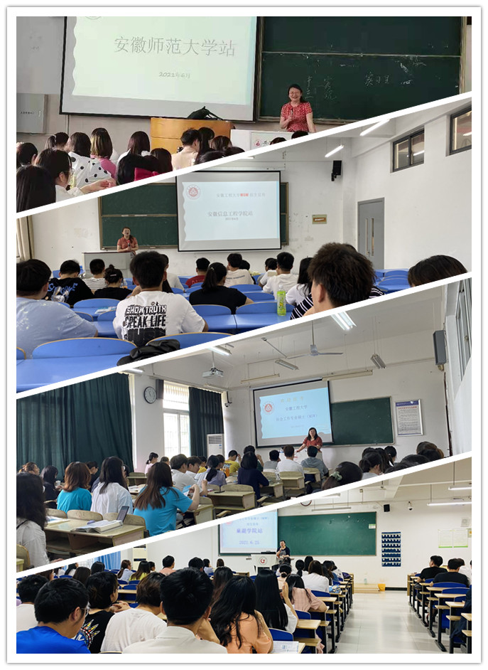 人文学院研究生招生宣传组分别前往安徽师范大学、安庆师范大学、铜陵学院、黄山学院、巢湖学院、池州学院、淮南师范学院、安徽信息工程学院等多家高等院校进行招生宣传工作。宣传组一行分别从学校概况、学院简况、骨干教师介绍、专业硕士招生方向、历年的招生计划、实际招生数量、初