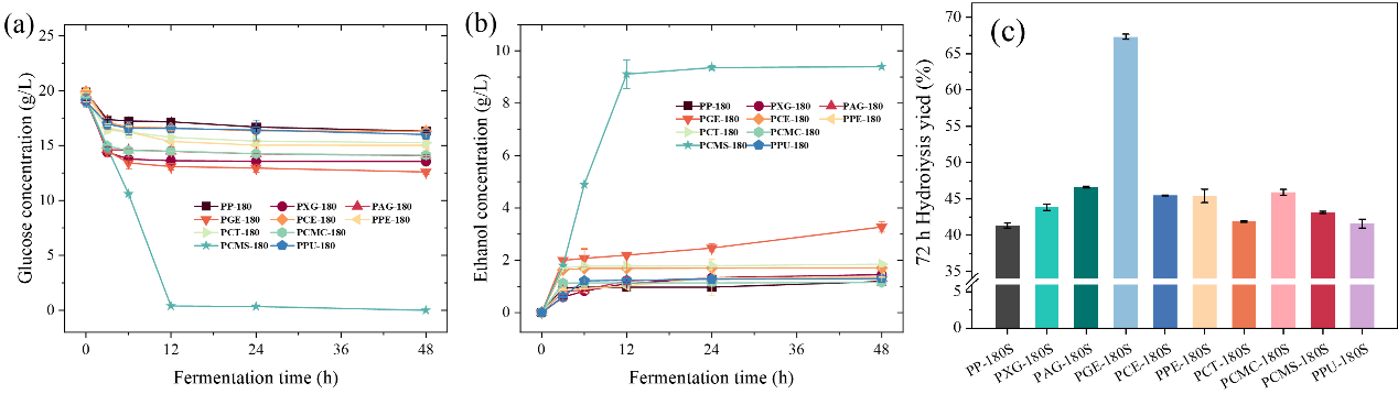 图2亲核聚合物辅助杨树酸性预处理对预预处理液酿酒酵母发酵性能以及预处理物料酶水解效率的影响