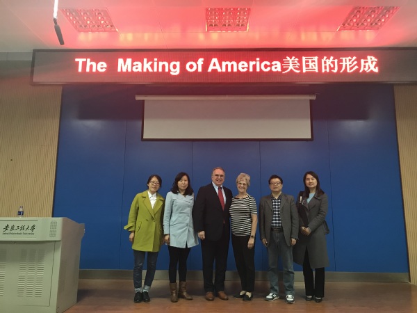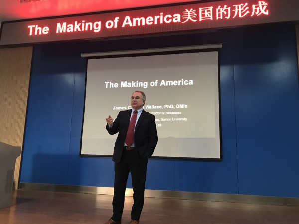 10月24日下午,美国波士顿大学詹姆斯·华莱士(James Wallace)教授应外国学院特邀请在5教117做了“美国的形成”(The Making of America)的精彩讲座。讲座由外院学院张凤梅老师主持,副院长黄焰结、英语系主任李新国以及部分师生参加了讲座。