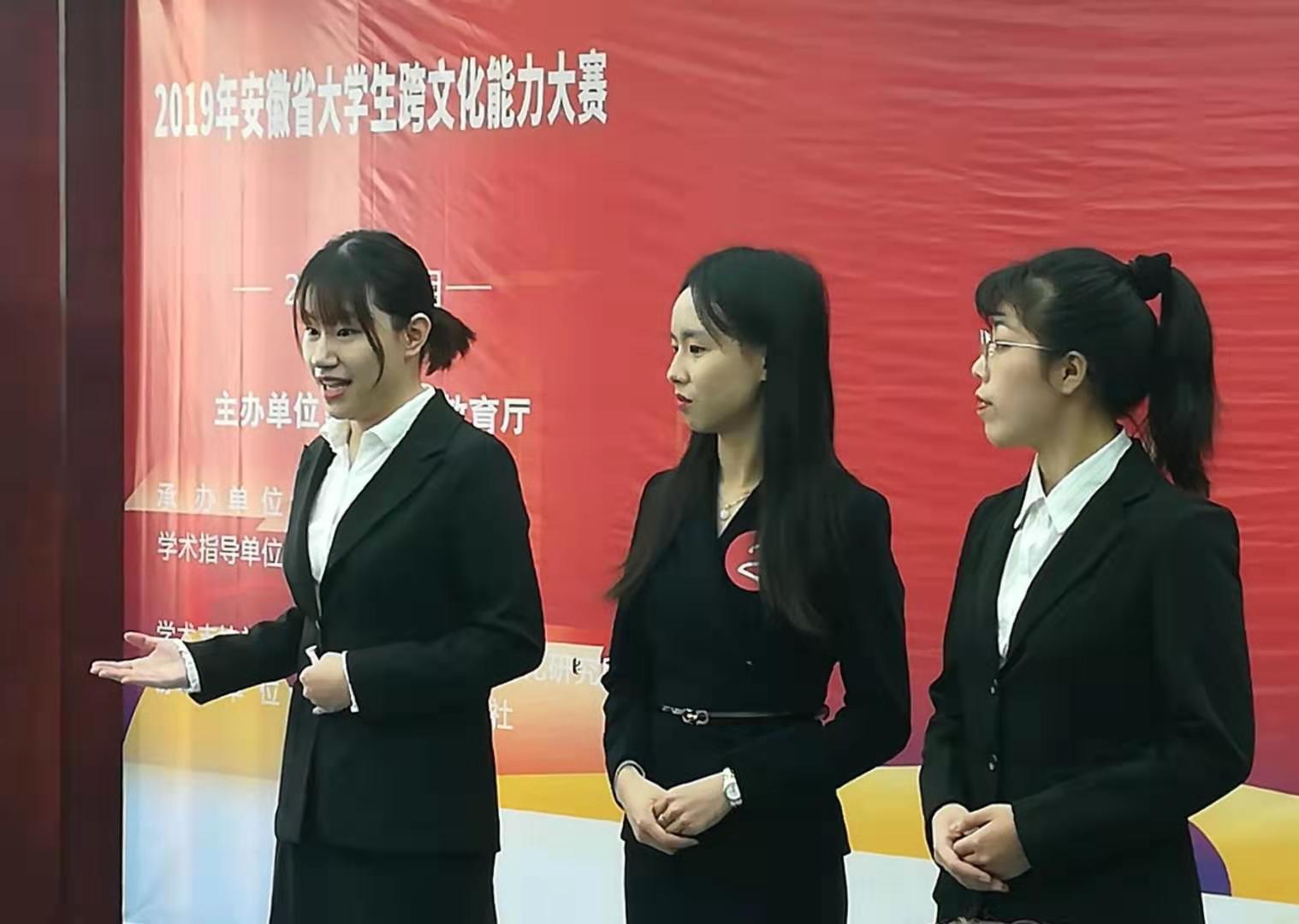 11月9日至10日,2019“外教社杯”长三角区域高校学生跨文化能力大赛安徽赛区选拔赛在安徽大学磬苑校区顺利举行。由外国语学院方志英老师、张曙望老师、张雪老师带领的由英语专业汪珊同学、金融工程专业谷雪同学和国际经济与贸易专业章佳怡同学组成的新利官网app代表队,通过激烈角逐,从安徽省25所院校代表队中脱颖而出,获得一等奖。