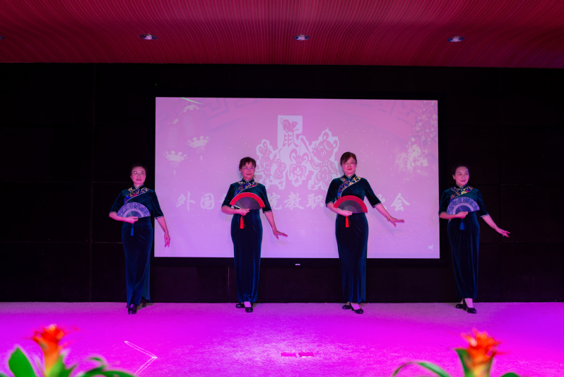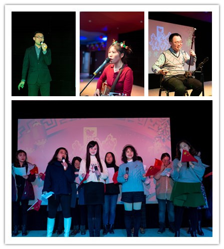 在英语系教师合唱《我和我的祖国》的歌声中拉开了文艺表演的序幕,歌曲《鸿雁》、《Santa Baby》、《滚滚长江东逝水》、《Five Hundred Miles》、《小幸运》等独唱歌曲音色优美;二胡独奏《沧海一声笑》旋律悠扬;由退休教师为主的服装表演《旗袍秀》,展现外院女教师的卓越风采。演出中还穿插了精彩的游戏和幸运观众抽奖活动,现场掌声、笑声不断。