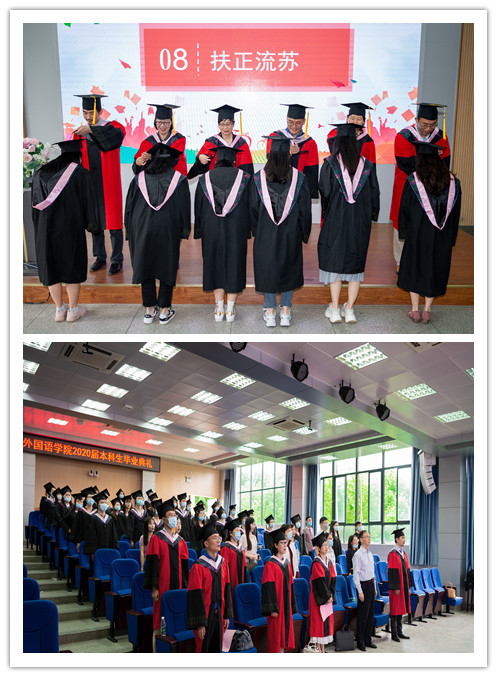 “还能不能返校?还能不能有一个毕业典礼?还能不能感受到扶正流苏学有所成的激动时刻?”这些问题是自新冠疫情发生以来一直萦绕在2020届毕业生心中的疑问。为了让本届毕业生精彩的大学生活画上圆满的句号,6月19日,外国语学院以线下和云端结合的方式为这届特殊的毕业生举行了一次特殊的毕业典礼。校党委副书记苏国红、外国语学院党政领导、教师代表、家长代表以及35名毕业生代表齐聚在5号教学楼117教室参加了线下典礼,120余名同学分散在5号教学楼的不同教室通过观看直播共同见证了属于自己的仪式。
