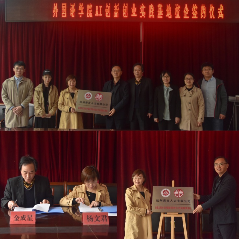 为开拓外国语学院就业创业工作新渠道,依托企业资源推进毕业生就业人职匹配的精准化,丰富在校生创业知识、增强创业意识,在前期磋商的基础上,4月23日上午,外国语学院与杭州君吉人力有限公司就共建AI创新创业实践基地举行了签约暨授牌仪式。外国语学院党政负责人以及杭州君吉人力有限公司负责人等出席仪式,会议由外国语学院副院长唐雪梅主持。