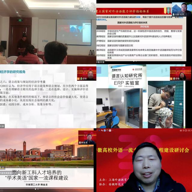为贯彻落实《教育部 安徽省人民政府 关于印发推动结构优化 建设高质量高等教育体系共同行动方案的通知》(皖政〔2021〕30号)、《中共安徽省委教育工委 安徽省教育厅 关于学习贯彻习近平总书记重要回信精神 加强外语院校建设和外语人才培养工作的通知》(皖教工委函〔2021〕407号)等文件要求,由上海外语教育出版社主办、安徽师范大学外国语学院和新利官网app外国语学院共同承办的“2022年新文科背景下语言学跨学科研究发展论坛暨安徽高校外语一流专业一流课程建设研讨会”于2022年1月16日上午通过线上线下同步直播的方式举行。省内高校外国语学院、外语系、大外教学系(部室)的负责人、国家级和省级一流专业和一流课程团队负责人,以及各高校的一线教师共计100多人参加了本次会议。