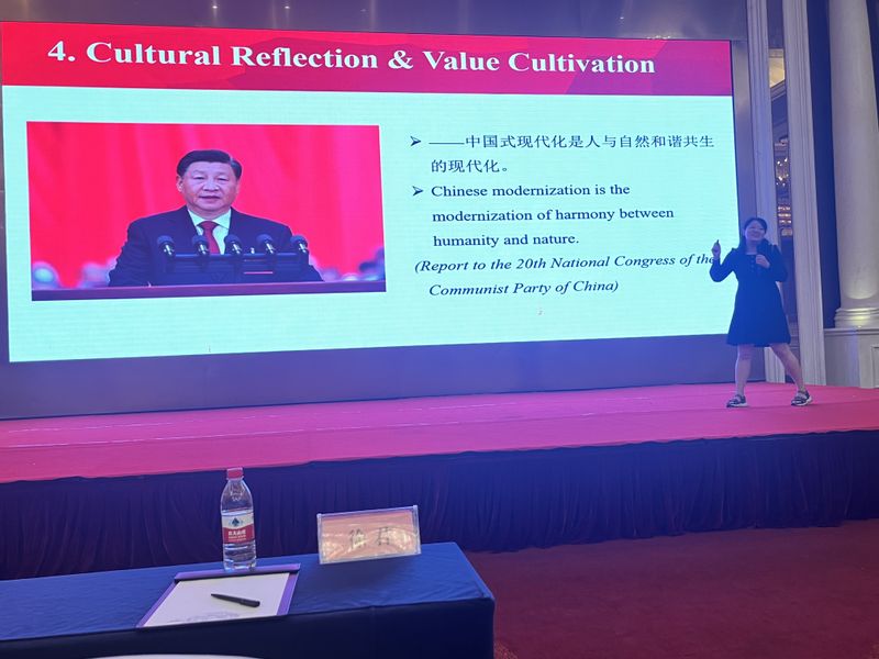 杨晓丽介绍了如何以外语教师为主导,通过大学英语单元教学内容,将立德树人的理念有机融入到课堂教学的各个环节,为塑造学生正确的世界观、人生观和价值观贡献积极作用。示范课生动有趣,构思巧妙,获得在场观摩教师的一致好评。汇报后,福建师范大学的林明金教授对杨晓丽老师的示范课进行了详细的点评。林教授充分肯定了该课程融入二十大报告精神设计的系统性和有效性,并提出了改进意见。