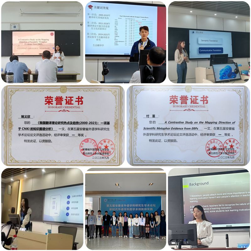近日,在由安徽省外国语言文学学会主办,淮北师范大学外国语学院承办的第五届安徽省外语学科研究生学术论坛中,我校唐雪梅教授指导的三位研究生投稿论文分获翻译组一等奖和语言学组一、二等奖,从合肥工业大学、安徽大学、安徽师范大学、安徽工业大学、安徽理工大学等二十余所省内高校投出的150多篇论文中脱颖而出。