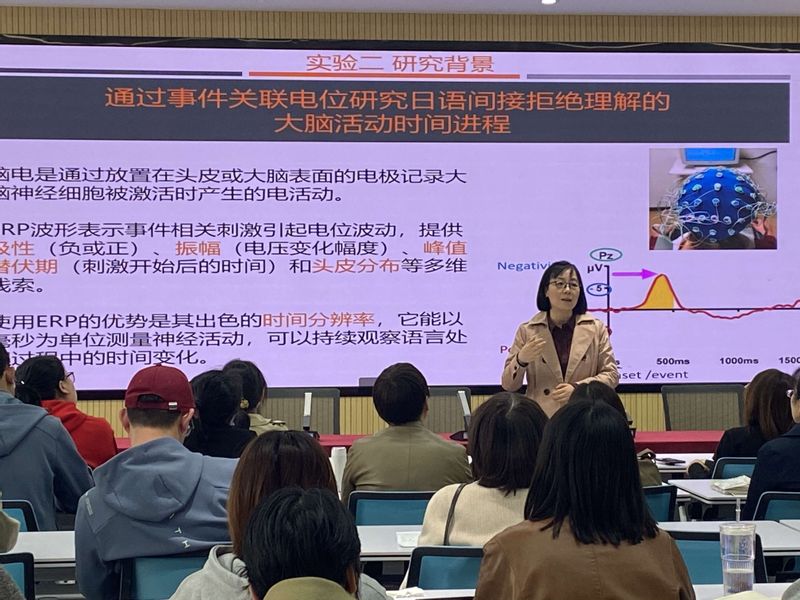 首先,汪敏博士作了题为“日语中间接拒绝理解的神经语言学研究:母语者与学习者的对比分析”的学术报告。汪博士从人际关系交往中间接拒绝的现象和特点出发,提出了开展实证研究探讨母语者和学习者理解间接拒绝现象的心理和神经基础。报告通过采用功能性磁共振成像(fMRI)和事件相关电位(ERP)等神经生理学方法,对日语母语者与日语学习者在处理间接拒绝未完结句时的机制进行了详尽的对比分析,揭示了日语母语者在理解涉及人际关怀表达间接拒绝时的未完结句大脑活动的空间定位,明确了母语者与相对不太熟悉日本语言习惯和文化习俗的日语学习者在处理这种句子时大脑活动的时间序列上的差异化特征。本研究通过被试的神经反应平均值及其个体差异,为人际关系会话风格会根据连续的个体特性发生变化提供了科学证据。然后,在讨论环节,老师们就fMRI和ERP两种实验的偏好以及特色、被试对象的遴选、低心智化能力学习者的研究等问题与汪敏博士进行了深入探讨和交流。