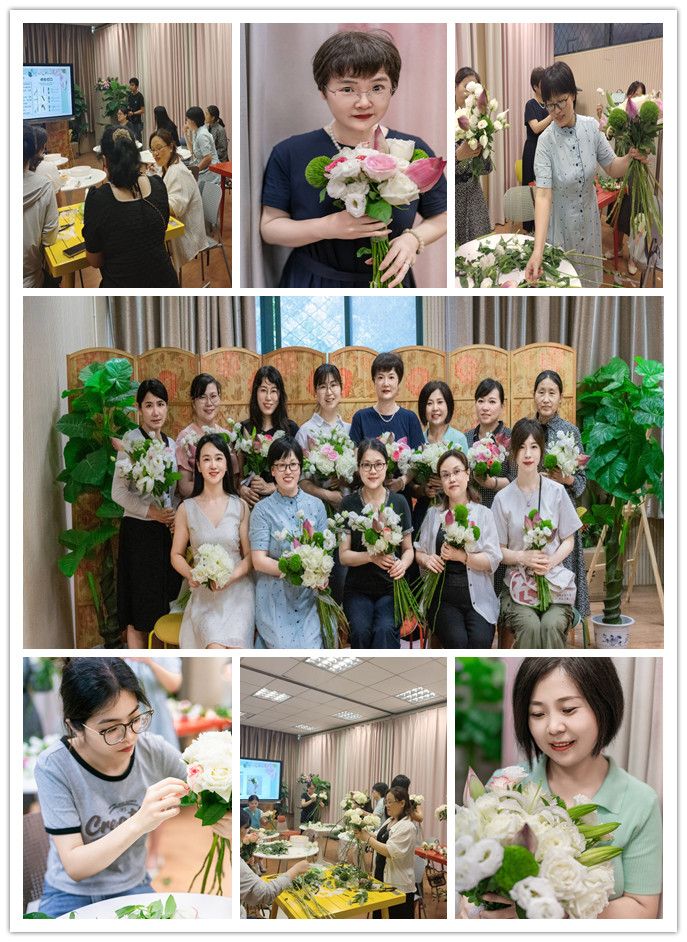 随后,张群为大家带来了花艺知识和捧花制作教学。她详细介绍了花卉的种类、养护方法以及花艺作品的创作技巧。老师们亲自动手,挑选喜欢的花卉和绿植,通过修剪、组合、装饰等步骤,结合自己的创意和想象,创作出一件件精美的捧花作品,既展现出老师们的艺术素养,也体现了她们对美好生活的追求和向往。