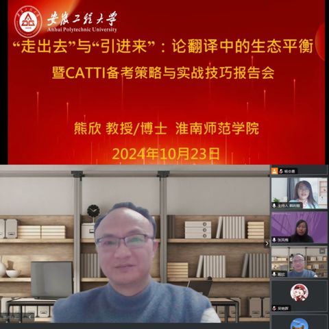 10月23日晚,外国语学院通过腾讯会议开展了全国翻译专业资格(水平)考试(China Accreditation Test for Translators and Interpreters,简称CATTI)备考策略与实战技巧报告会,活动邀请淮南师范学院教授熊欣博士,做了题为《“走出去”与“引进来”:论翻译中的生态平衡》的学术报告,针对CATTI二级笔译考试对研究生进行了考前指导。副院长韩利敏教授、张凤梅教授、学院硕士生导师以及全体研究生参加了此次线上学术交流活动,活动由副院长韩利敏在线主持。