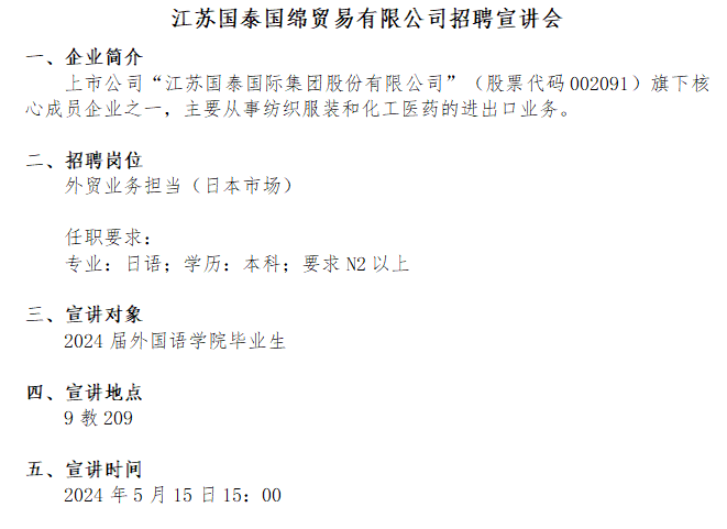 江苏国泰国绵贸易有限公司招聘宣讲会