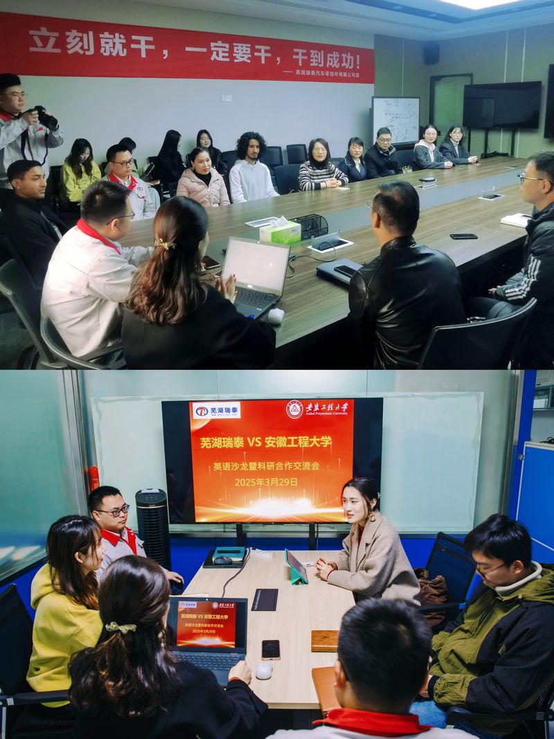 3月29日上午,新利官网app外国语学院、国际教育学院与芜湖瑞泰汽车零部件有限公司联合举办的“英语沙龙暨校企科研合作交流会”在瑞泰公司成功举行。瑞泰公司董事长兼总经理刘春平、人力资源部部长朱媛媛、外国语学院副院长韩利敏、教师张兵和国际教育学院教师涂文婷出席了本次交流活动。活动以“语言赋能,创新驱动”为主题,汇聚高校研究生、留学生及企业代表近50人,通过语言文化交流与科研对话,深化校企合作新内涵,探索人才共育新模式。