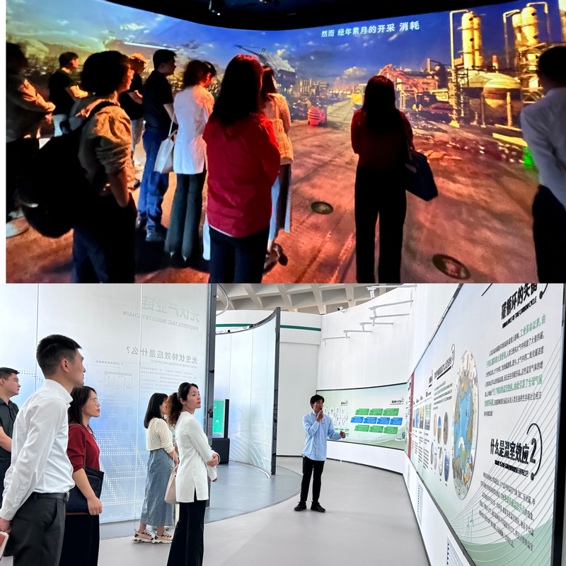 最后,我院教师一行参观了湾沚区信义碳清洁能源科普中心,通过声电展厅生动的科普宣传片对发展绿色清洁能源的重要性、光伏发电系统的原理和产品进行了参观学习。