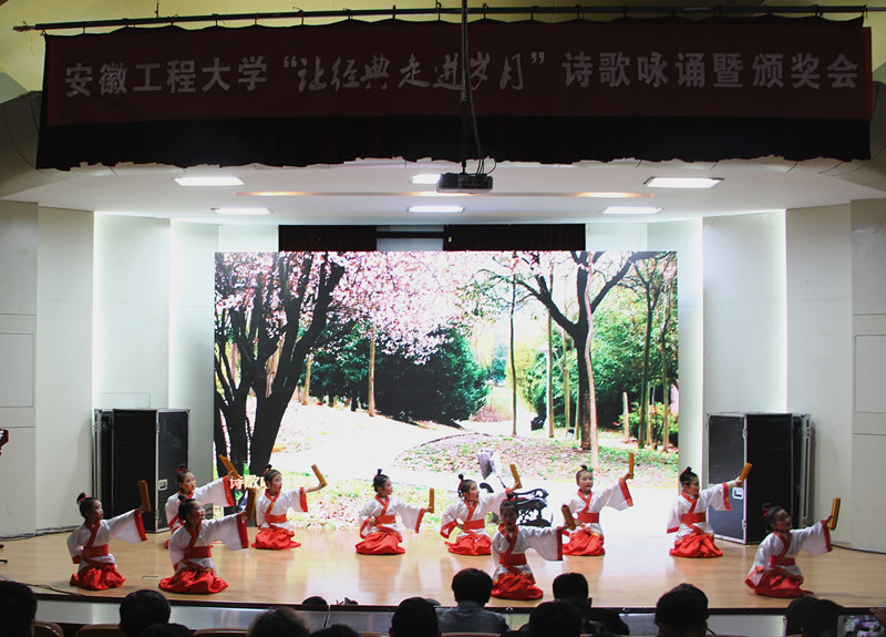 让经典走进岁月”诗歌咏诵暨颁奖会于2018年4月14日下午三点在学术报告厅由校工会、宣传部、校团委联合举办。我校附幼大班小朋友表演的舞蹈《春晓》作为第一个节目展示。
