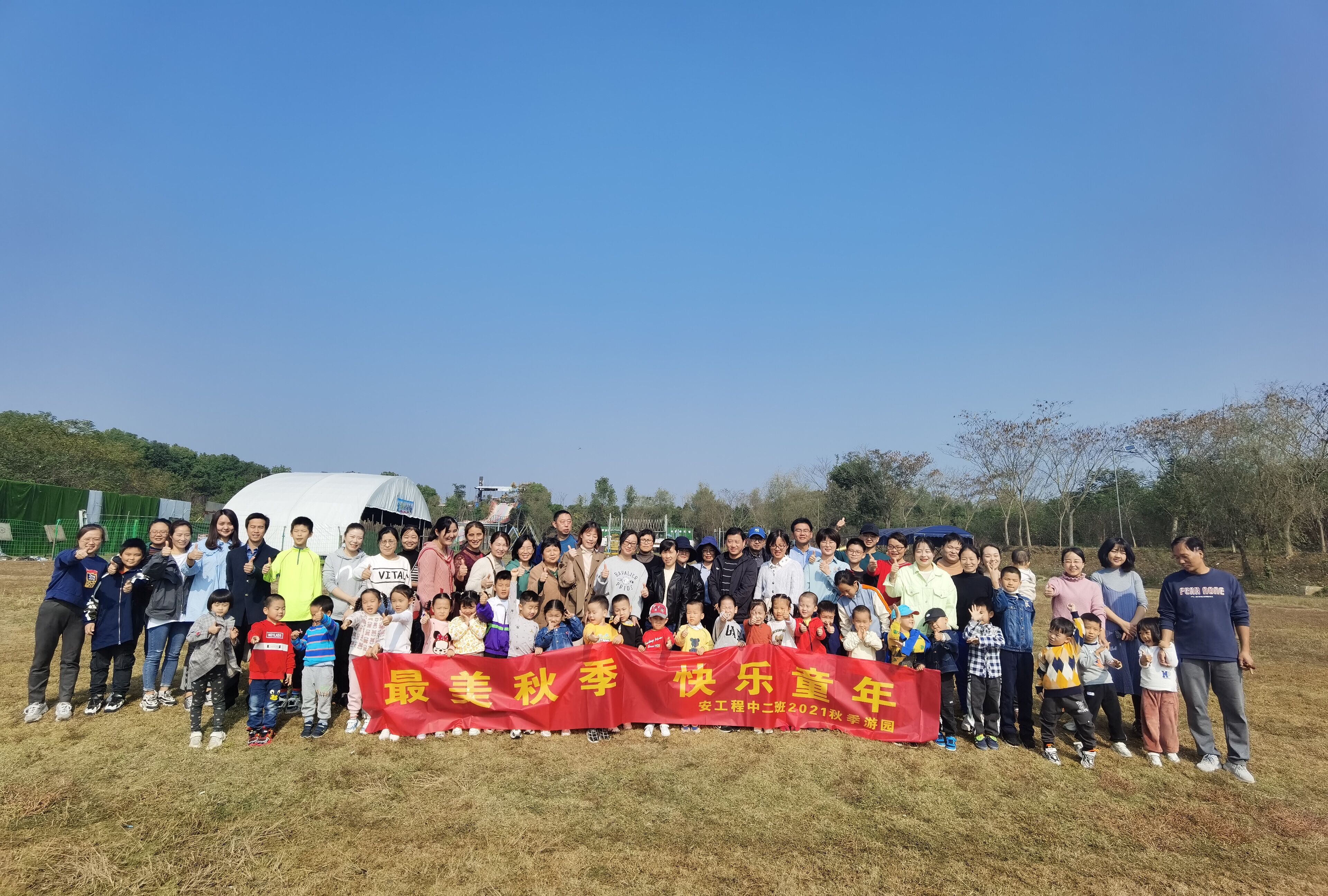 2021年10月23日清晨,在老师的陪伴下,中二班的小朋友们和爸爸妈妈坐上大客车,期盼已久的快乐旅程开始了。一路上,孩子们像一只只快乐的小鸟,叽叽喳喳,开心又兴奋,不知不觉就来到了此行的目的地——芜湖县绿荣山庄。