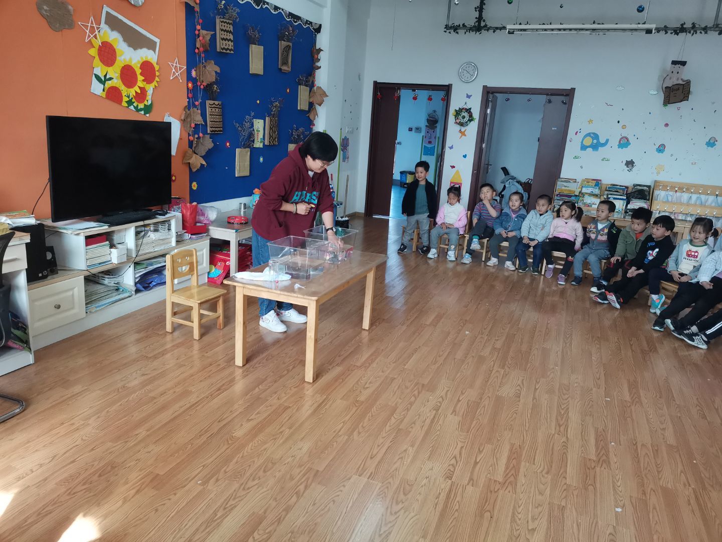 本次活动,中一班老师以晨间活动、早操、教学活动等丰富多彩的活动形式向家长展示了幼儿在园的生活学习情况。晨间活动形式多样,有室内桌面游戏和户外自由拍球练习,孩子们自主选择游戏类型,或静或动,玩耍嬉戏。晨间活动之后是早操展示。在《加油鸭》、《足球操》、《蒲公英在歌唱》等欢快的音乐声中,孩子们一起快乐地舞蹈、伸展四肢,合着音乐边唱边跳,欢快的氛围感染着在场的每一位家长。集体活动环节,家长们走进班级近距离观摩了孩子们的学习与表现。社会活动《想让你开心》,黄老师通过讲述小黄鸡的故事,让孩子们懂得了什么是友谊,如何关爱他人,做一个温暖的宝宝。科学活动《好玩的空气》,蒋老师通过“魔术表演”的方式让孩子们认识到空气的存在,并用塑料袋抓空气的小游戏让小朋友们认识到空气是无色无味却处处存在的,同时也跟孩子们传递了保护大气环境的绿色环保理念。活动中,教师们注重趣味性,多角度启发幼儿,让孩子们在游戏中探索、合作、收获。