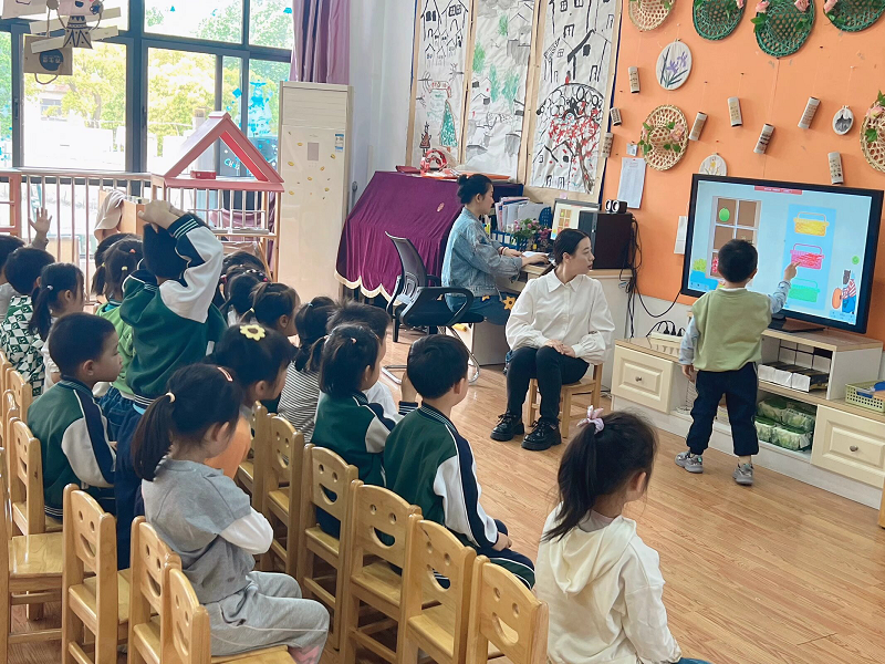 倾听·寓教于乐。在学习和游戏活动中,老师们精心设计教学环节。通过生动的语言讲述绘本故事《章鱼先生卖雨伞》,用角色扮演的方式吸引孩子们集中注意力观察,主动思考,大胆表达。通过手工制作雨伞,给雨伞上色等培养孩子们的色彩表现力。数学活动《大熊的储藏室》,老师通过谜语的形式导入,激发出孩子们的兴趣,使用课件按照食物的颜色、形状、种类进行分类,并借助“闯关游戏”初步感知二次分类,同时引导孩子们将班级里的图书、玩具等物品分类摆放,让班级看起来更整洁。在轻松愉快的氛围中,家长们也以幼儿的视角体验和感受孩子们的成长。