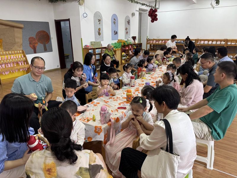 在一片欢乐的气氛中,活动迎来了温馨的尾声。孩子与家长们围坐在一起,分享香甜可口的月饼,品味中秋的团圆滋味。月饼的清香与笑声交织,节日的仪式感与亲情的温暖交融,构成了一幅动人的画卷。