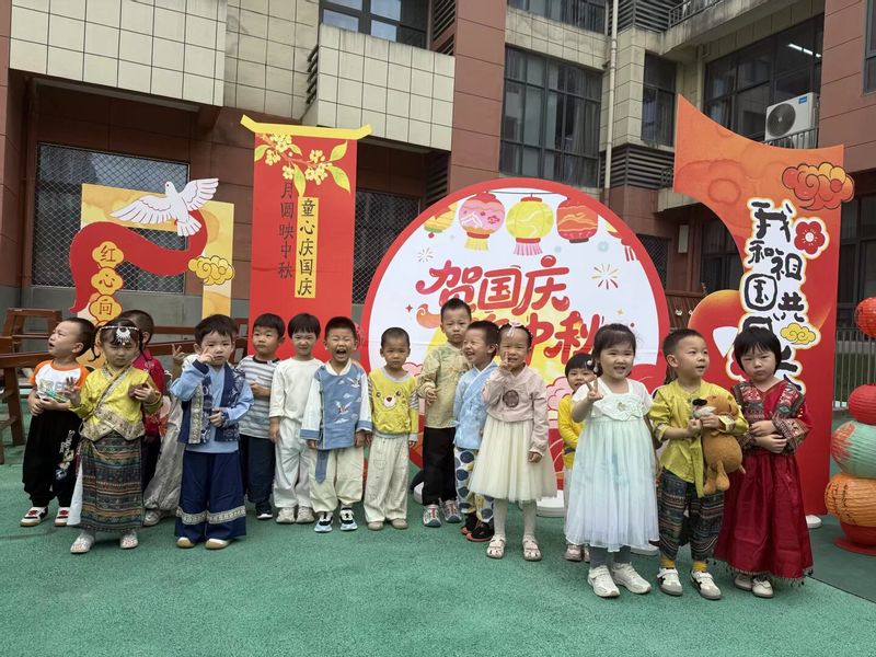 上午8点30分,校园里已洋溢着浓厚的节日氛围。小朋友们身着各具特色的民族服饰,在老师与家长的带领下齐聚操场,参加庄严的升旗仪式。伴随着激昂雄壮的《义勇军进行曲》,鲜艳的五星红旗冉冉升起,稚嫩童声与教师歌声交织,孩子们挺直小小的身姿,仰脸行注目礼,满怀敬意注视着国旗高高飘扬。国旗下,大班小朋友们用稚嫩的语言诉说着对祖国妈妈的祝福与热爱,以及对双节的期待。